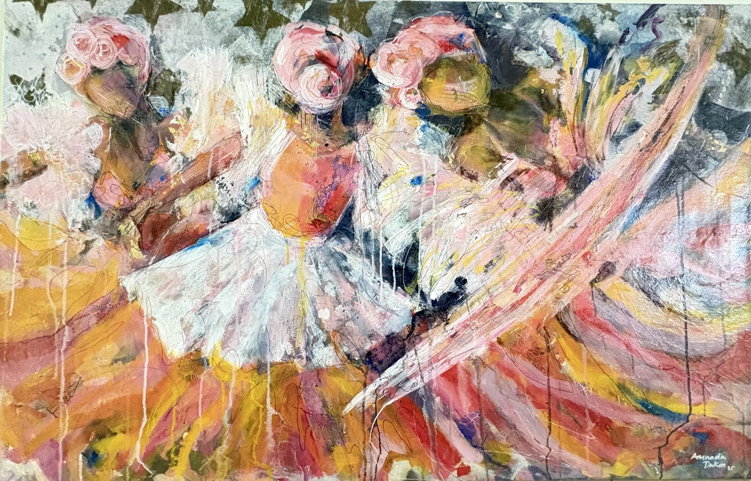 Sounds easy, right? But to get to that point where I love what I create (the colours, the marks, the feeling), it often involves an unexpected journey. Recently, I was working on a large piece of three dancers moving to the music. I knew exactly what I wanted express. I knew the canvas size and how long it should take. I was happy with the process of layering collage, pen, pastel, and paint. It took longer than expected to capture the energy and emotion I wanted to see. I had to test new ideas, remain open to change and eventually, I hit that sweet spot. The result was better than I imagined because of the dance I did to get there.